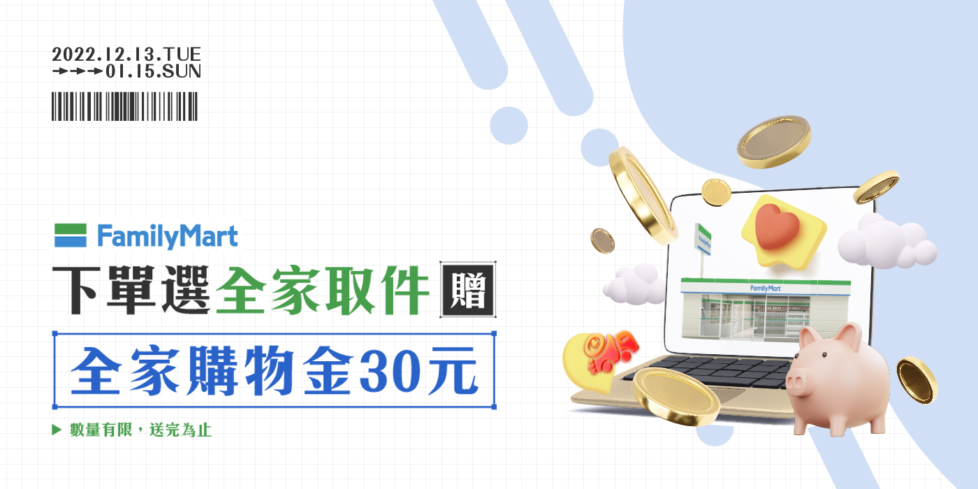 於活動時間內 ( 2022 年 12 月 13 日起至 2023 年 01 月 15 日止 ) 完成下訂並於 2023 年 01 月 31 日 23:59 前 在全家完成取件者,即享有獲取資格 ( 活動品項 30元全家購物金 乙組 ),贈送對象將於 2023 年 02 月 03 日起至 2023 年 02 月 12 日止依實際完成取貨順序發放,因數量有限送完為止,如未獲贈不另通知。